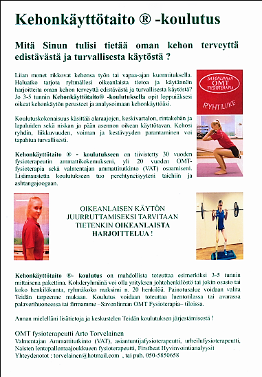 Kehonkäyttötaito®- koulutus; toiminnallisen liikkuvuuden ja hallinnan harjoittelu, 90 itäisen alueen A-luokan yleisurheilijaa (15-20 v.) Tanhuvaara, SUL Aluepäällikkö Ilpo Koponen ja Valmennuspäällikkö Jarmo Hirvonen "Harjoitus oli hyvä ja ajatuksia herättävä. Nykyään edelleen liikaa mennään urheilussa ja liikunnassa liikkeestä toiseen ajattelematta mitä tehdää. Yksittäiset liikkeet voivat sinällään olla ihan hyviä, mutta jos niissä ei ole ajatusta mukana, ryhdin ja vartalon kontrollia ja itsesäätelyä niin paljon menee hukkaan ja jää käyttämättä monipuolisuutta tehoharjoittelussa, vammaherkkyys lisääntyy, kehon oman palautejärjestelmän käyttö vähenee yms. Vain ajatteleva ja analyyttiseksi kasvava sekä omia tekemisiään kriittisesti arvioiva urheilija pääsee omalle huipputasolleen