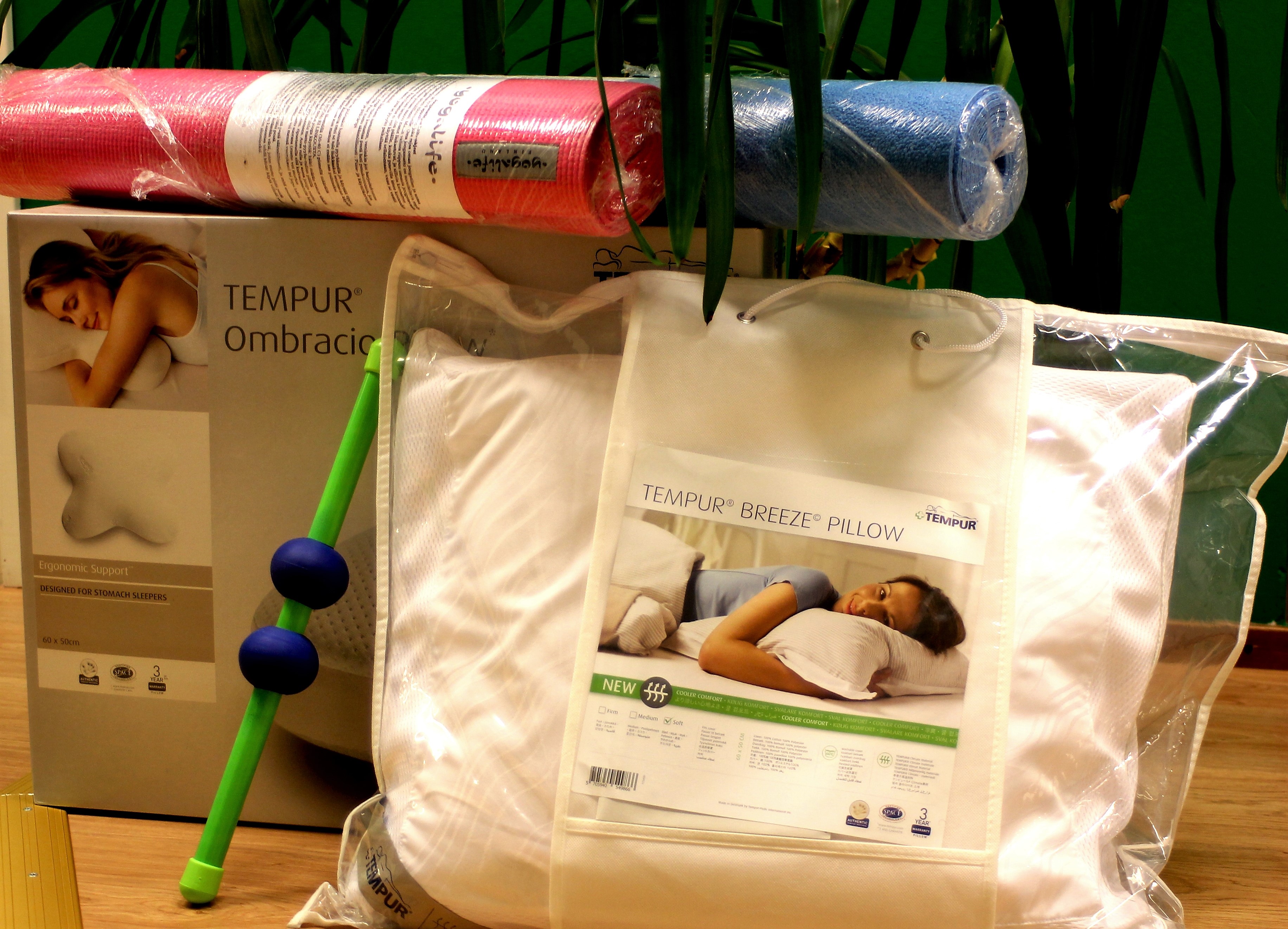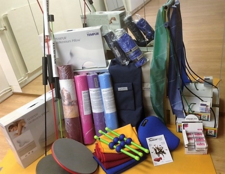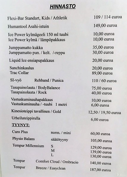 : -urheiluteipit, kinesioteipit, kylmäpakkaukset, niskatyyny Tempur, joogamatot, Flexibarit, harjoituskuminauhat, tasapainolaudat, Humantool-satulatuolit, niskan tukikaulurit